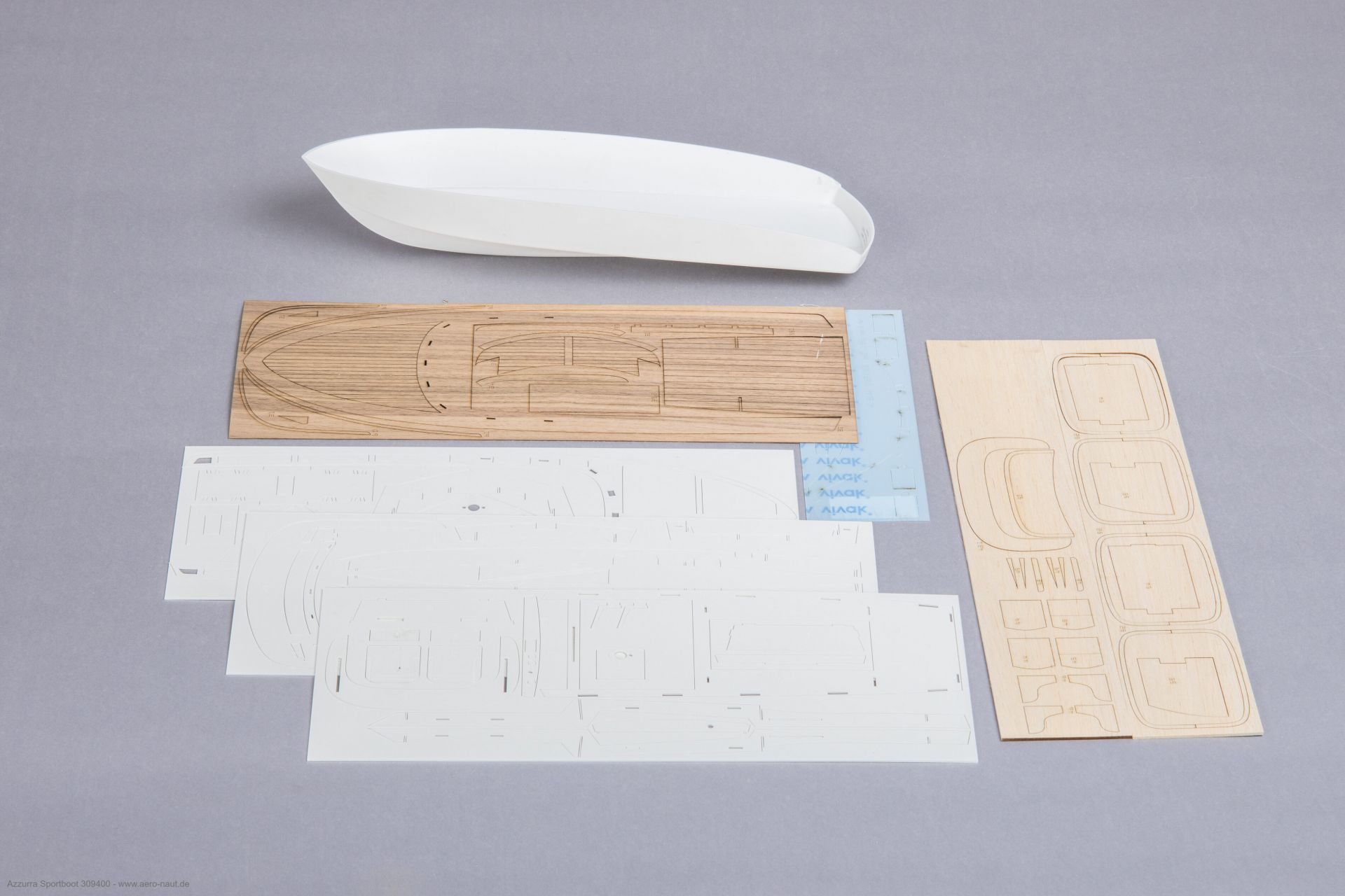 Delene i byggesættet er i ABS og træ, og de er udskåret præcist med CNC-styret laser. Det giver en hurtig og enkel samling af modellen. Der medfølger stort et stort antal fittingsdele, herunder dele til ror og skrueaksel.