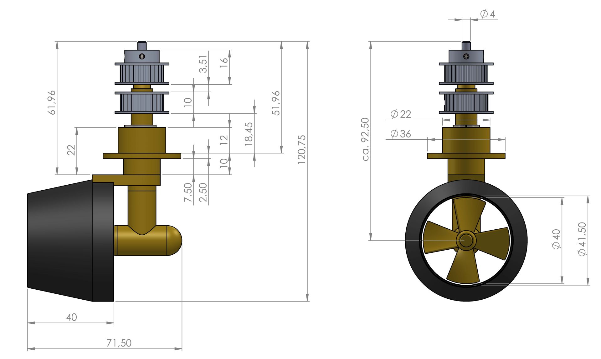 • Tandremshjul i aluminium til drejebevægelsen, deling 5 mm (fra 60 mm propeldiameter).