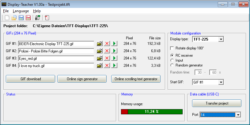 Software "Display-Teacher" til Windows til overførsel af GIF til skærm og konfiguration.