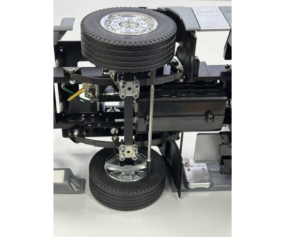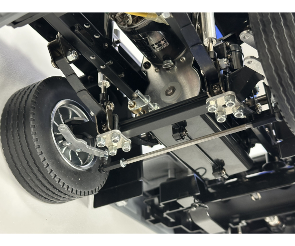 I modsætning til den originale foraksel fra Tamiya, giver denne foraksel det rigtige udslag på forhjulene, så lastbilen drejer bedre.