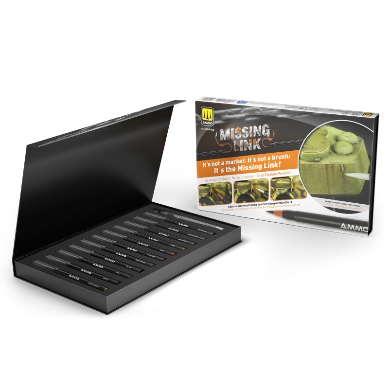 Sættet er udviklet til præcision, alsidighed og brugervenlighed, og de 12 transparente farver er nøje udvalgt til at skabe realistiske effekter på militære køretøjsmodeller. Med Missing Link Brush Tip-markørerne kan du påføre alt fra filtre til avancerede weathering‑effekter.