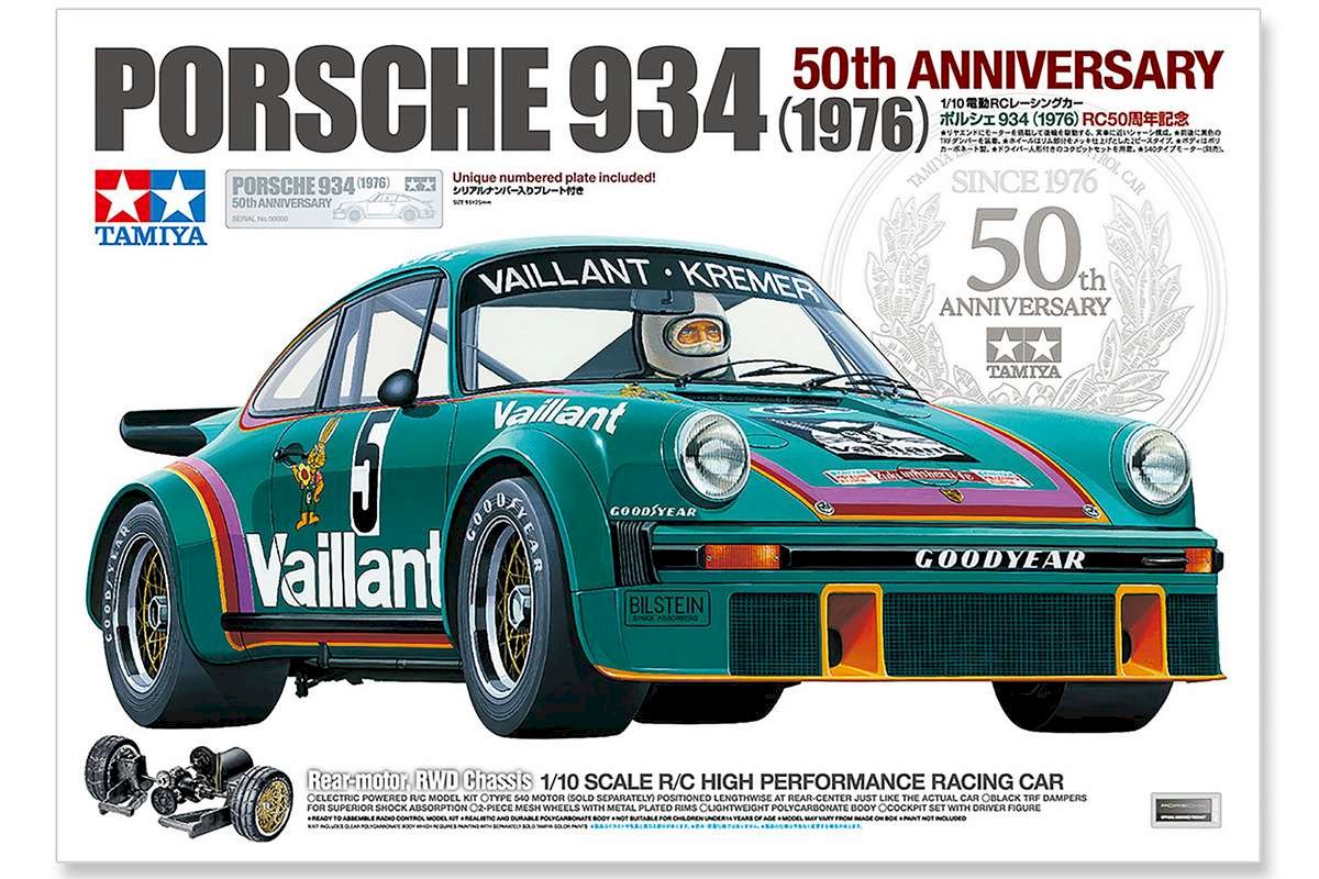 For at fejre 50-års jubilæet for vores første R/C-model Porsche 934 er vi stolte af at annoncere udgivelsen af Porsche 934 med et specialdesignet chassis, hvor motoren er placeret på langs i den bageste midtersektion og driver baghjulene ligesom på den rigtige bil.