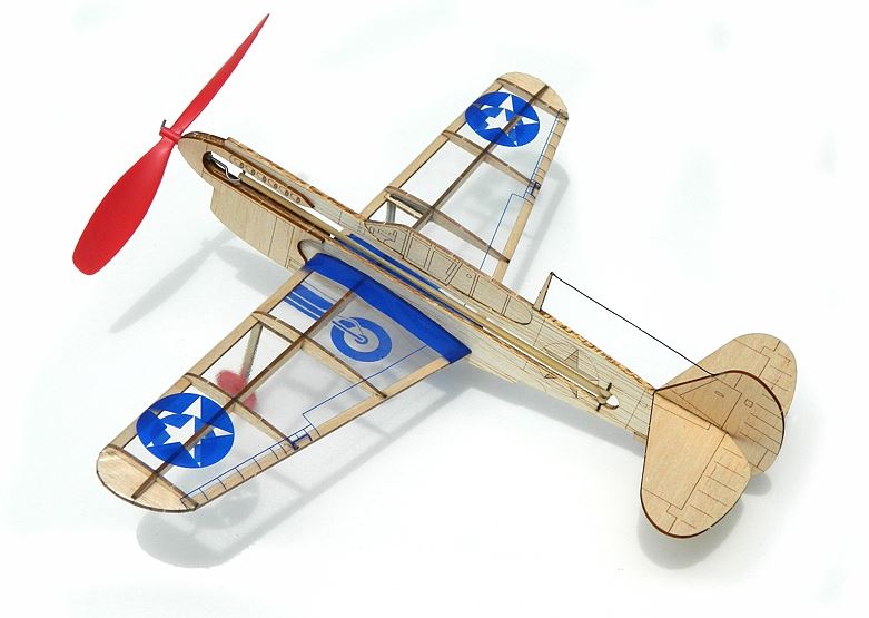 Laserskåret model i balsatræ beregnet til flyvning med den medfølgende elastikmotor.