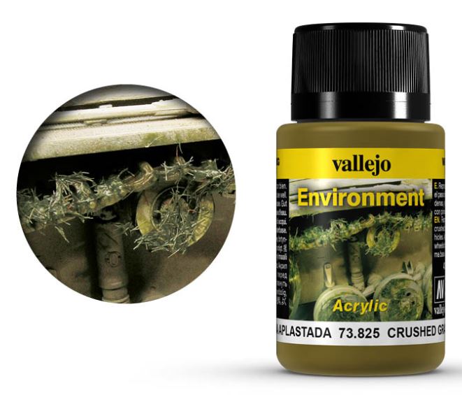 Crushed Grass indeholder spor af vegetation og genskaber græs, der stikker ud fra hjul og bælter på køretøjer. Kan også bruges i dioramaer, hvor græsset skal være knust og gjort fladt efter tunge køretøjer.