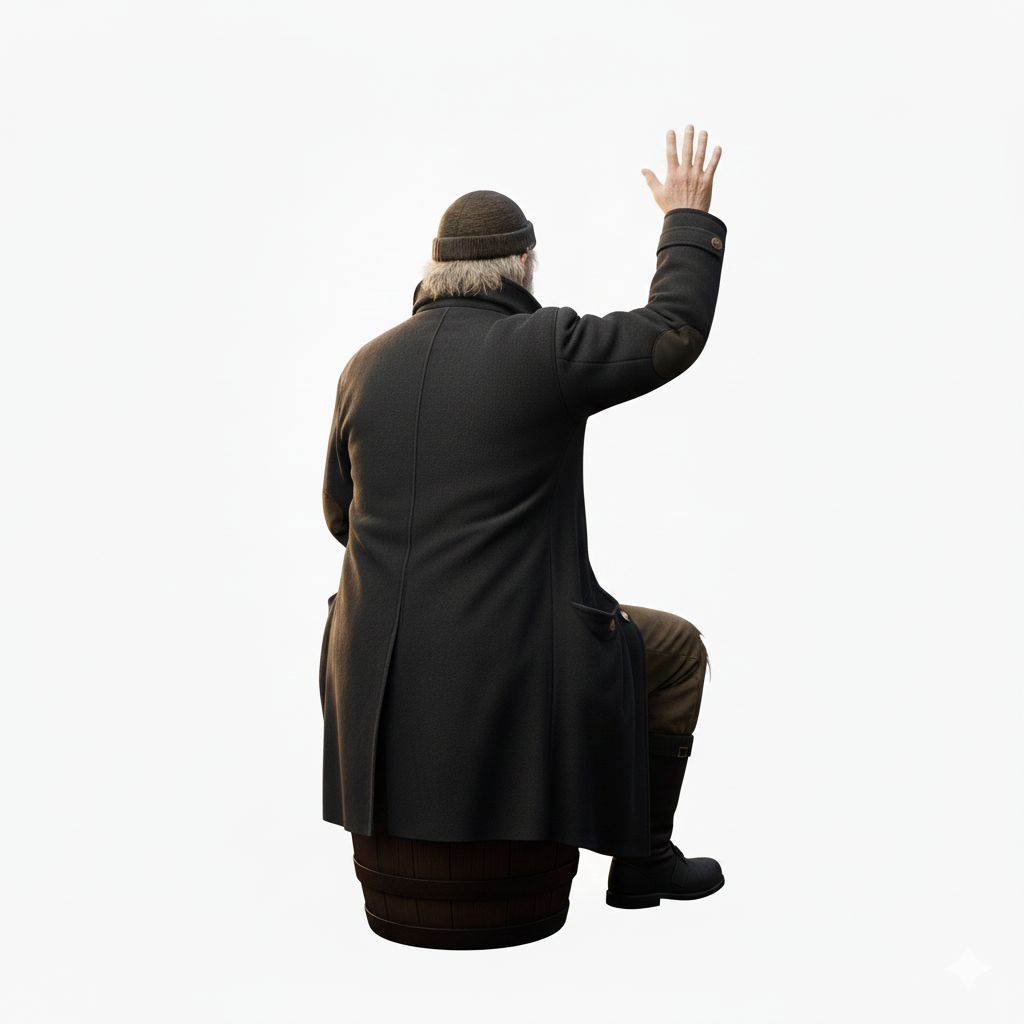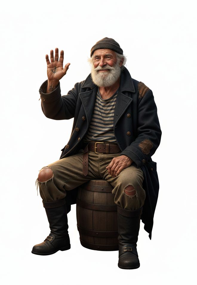 Gammel sømand siddende på en trætønde i skala 1/20.